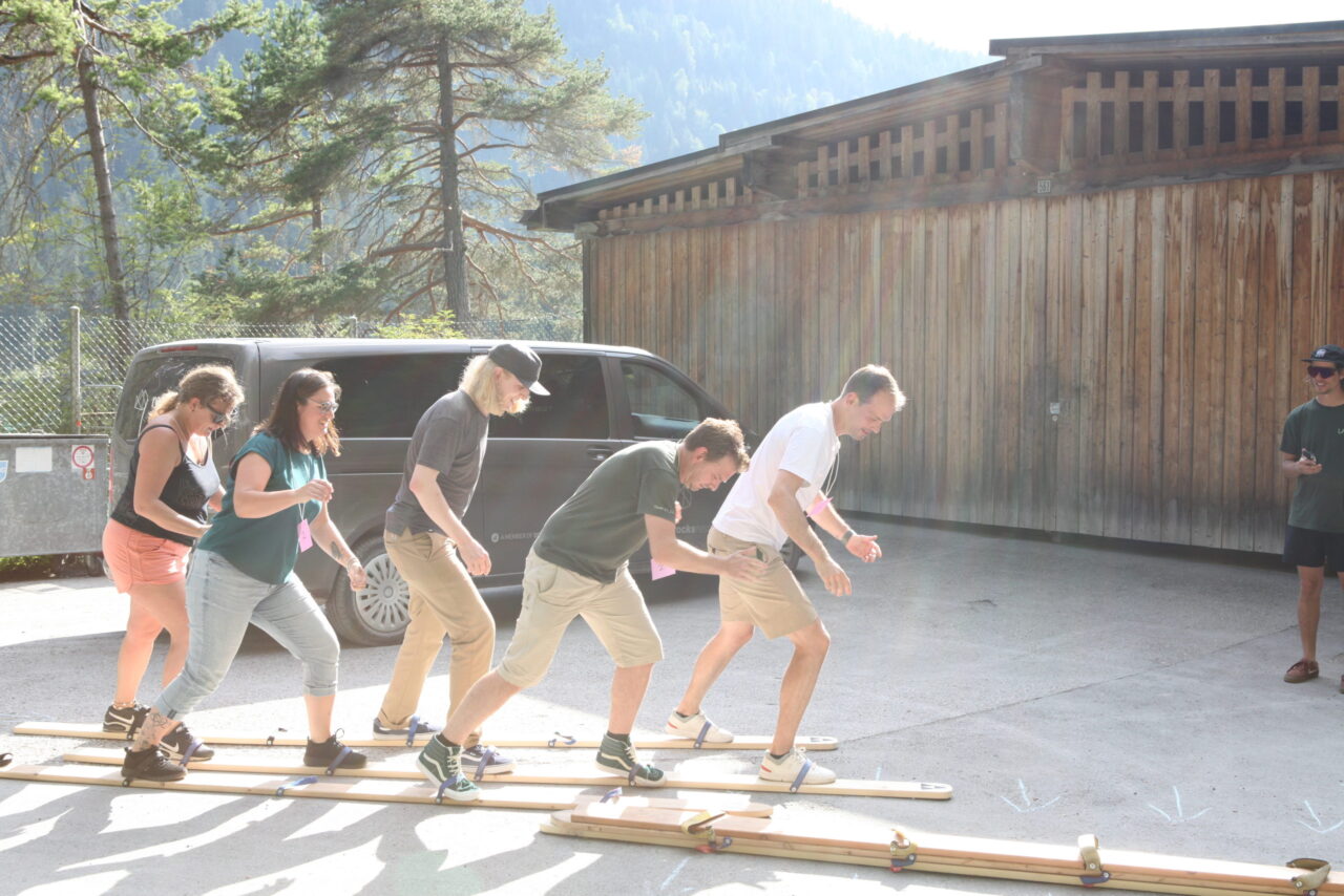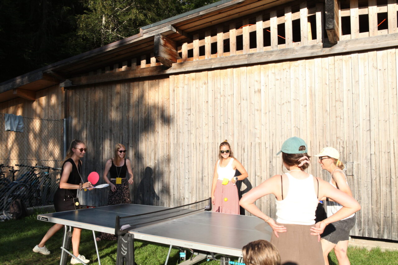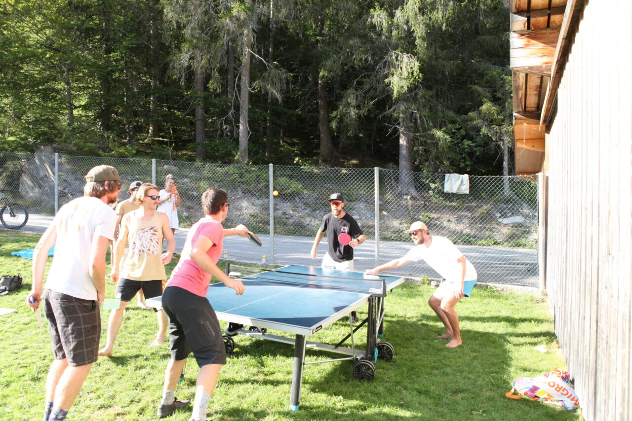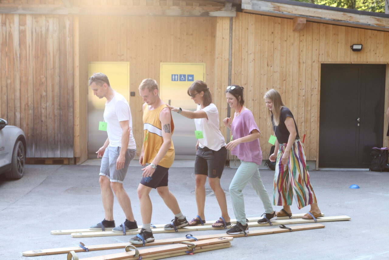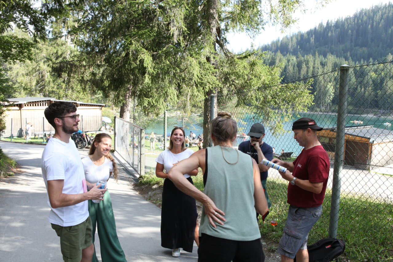 The celebration began with a delicious aperitif. Meanwhile, some of the employees competed in the Caumasee Olympics in four disciplines: four-racket ping pong, backward spelling, tandem skiing, and cup tower building. Team 4 (Tim, Felix, Bo, Tino, and Andi) secured first place. Team 6 (Jule, Bea, Gaetan, Jonas, and Luka) came in second. Third place went to Team 7 (Sarah, Eliane, Andreas, Larissa, and Marten). The winning teams were rewarded with great prizes.