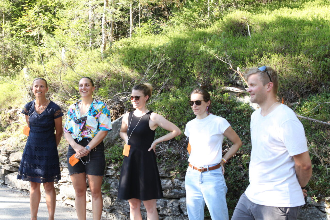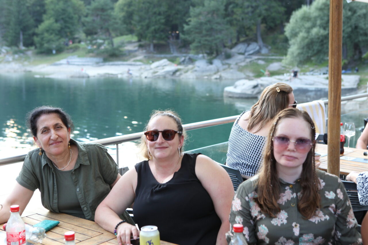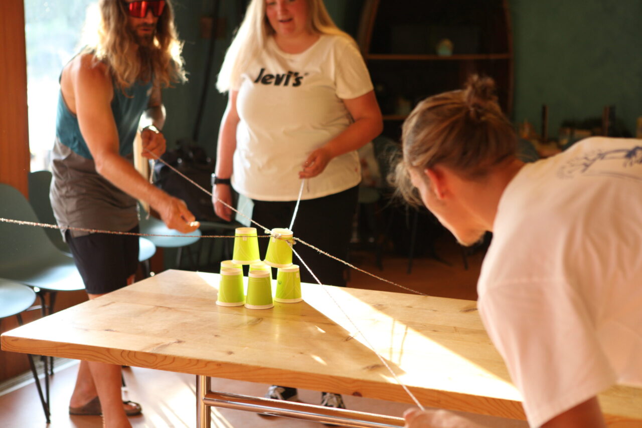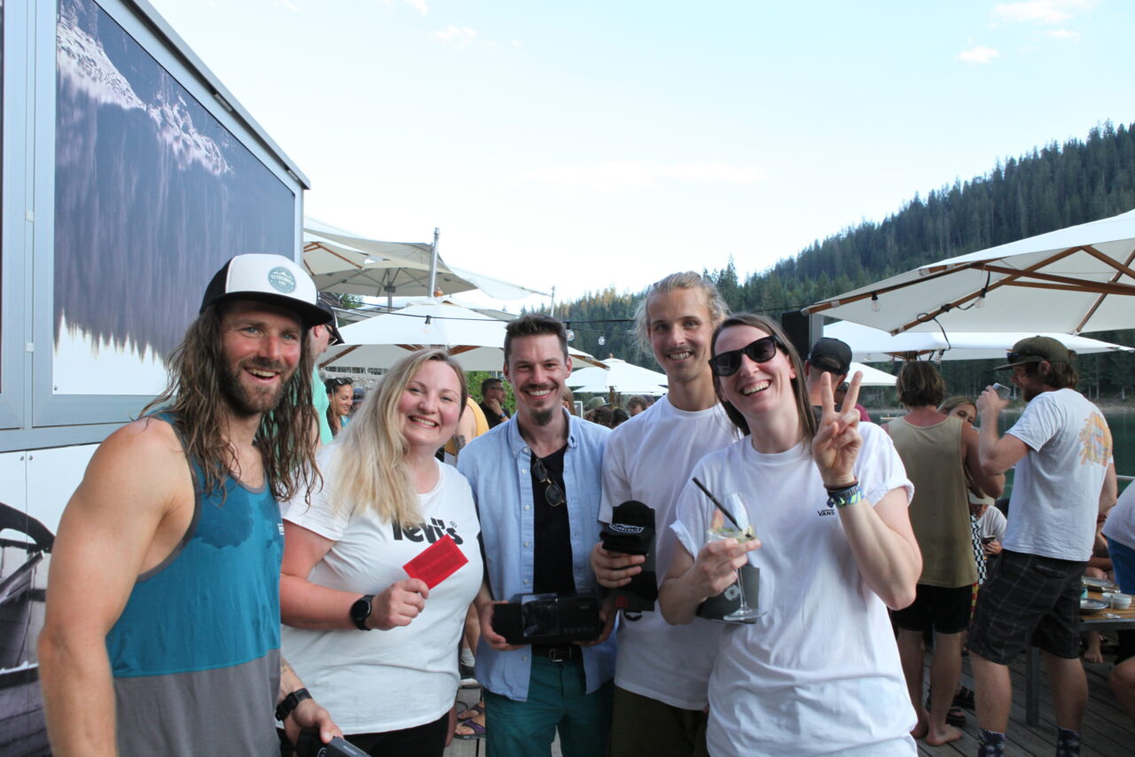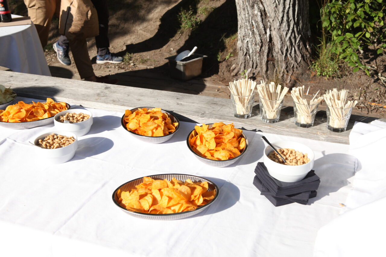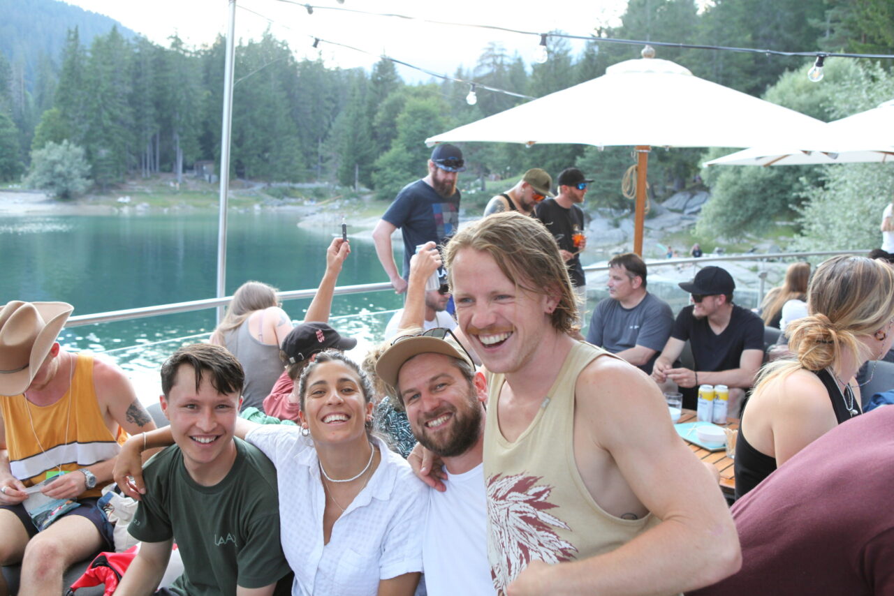 The celebration began with a delicious aperitif. Meanwhile, some of the employees competed in the Caumasee Olympics in four disciplines: four-racket ping pong, backward spelling, tandem skiing, and cup tower building. Team 4 (Tim, Felix, Bo, Tino, and Andi) secured first place. Team 6 (Jule, Bea, Gaetan, Jonas, and Luka) came in second. Third place went to Team 7 (Sarah, Eliane, Andreas, Larissa, and Marten). The winning teams were rewarded with great prizes.